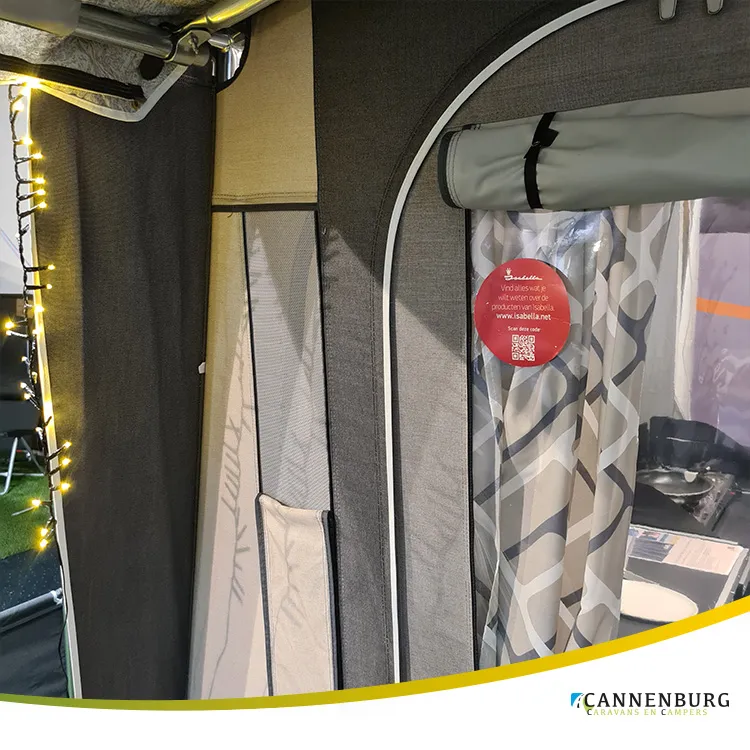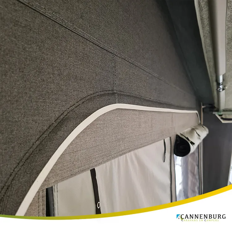 Bij het kijken naar de voorzijde van de voortent zie je direct de twee uitritsbare frontdelen. Beide delen kun je omwisselen. Wanneer jij de ingang graag aan de andere kant wilt hebben, dan is dat geen enkel probleem. Dit kan simpelweg door ze om te draaien. Een leuk detail zijn de ventilatieroosters die dichtgeritst kunnen worden naast de frontdelen. Een van de belangrijkste voorzorgsmaatregelen die je in een voortent moet nemen om schimmelvormingen tegen te gaan, is natuurlijk ventileren. En dat geldt vooral voor een voortent met PVC dak. Uiteraard is er in de nok een ventilatierooster aanwezig, zoals je gewend bent van de meeste Isabella voortenten.