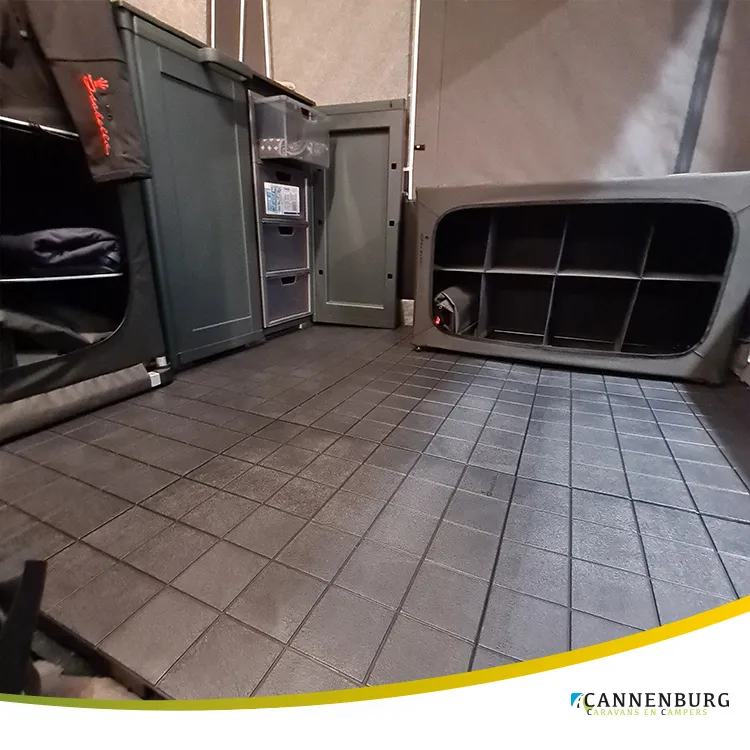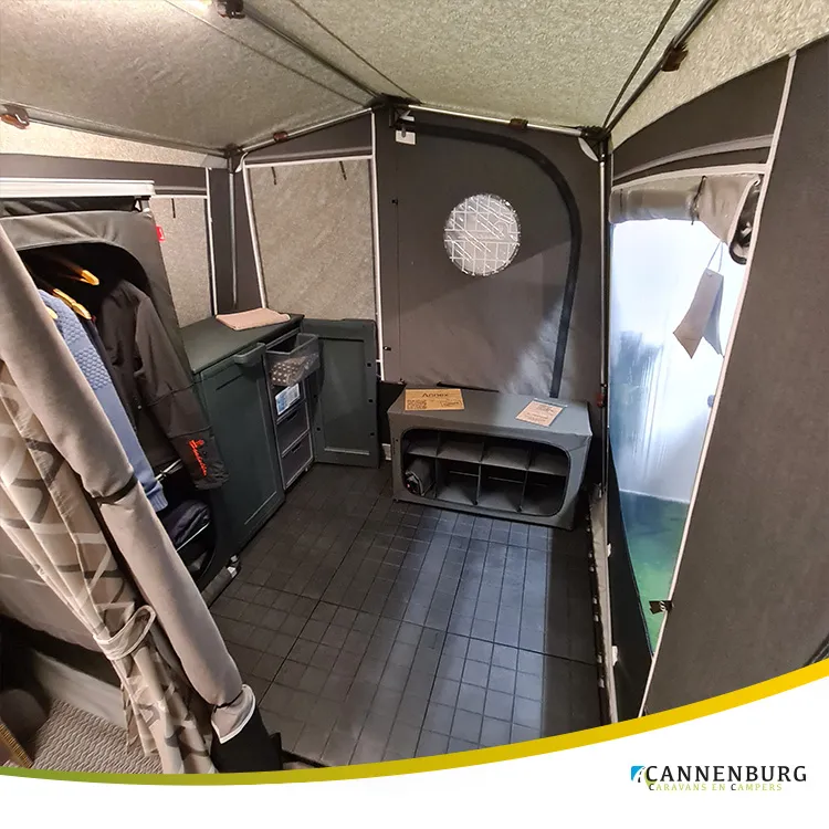 De ramen zijn voorzien van zowel smaakvolle gordijntjes als blinderingskleppen. Deze blinderingskleppen zorgen ervoor dat het kunststof raam niet uitdroogt door de zon. Erg belangrijk, vooral voor een seizoenstent, want deze staat toch het gehele jaar in de (volle) zon. Onder de ramen bevindt zich de slikrand. Deze zit aan de binnenzijde, maar ook aan de buitenzijde van de voortent en verbergt erg netjes de haringen met elastieken. Aan de zijkant van de Nordic heeft het bedrijf hun leuke voortentuitbouw vastgezet, en ik moet toegeven dat het een behoorlijke aanwinst is op het geheel. De uitbouw was in dit geval volledig ingericht met kasten, die gevuld waren met kleding, maar hij kan uiteraard ook fantastisch volstaan als schuurruimte of zelf als extra slaapcabine. Erg leuk!